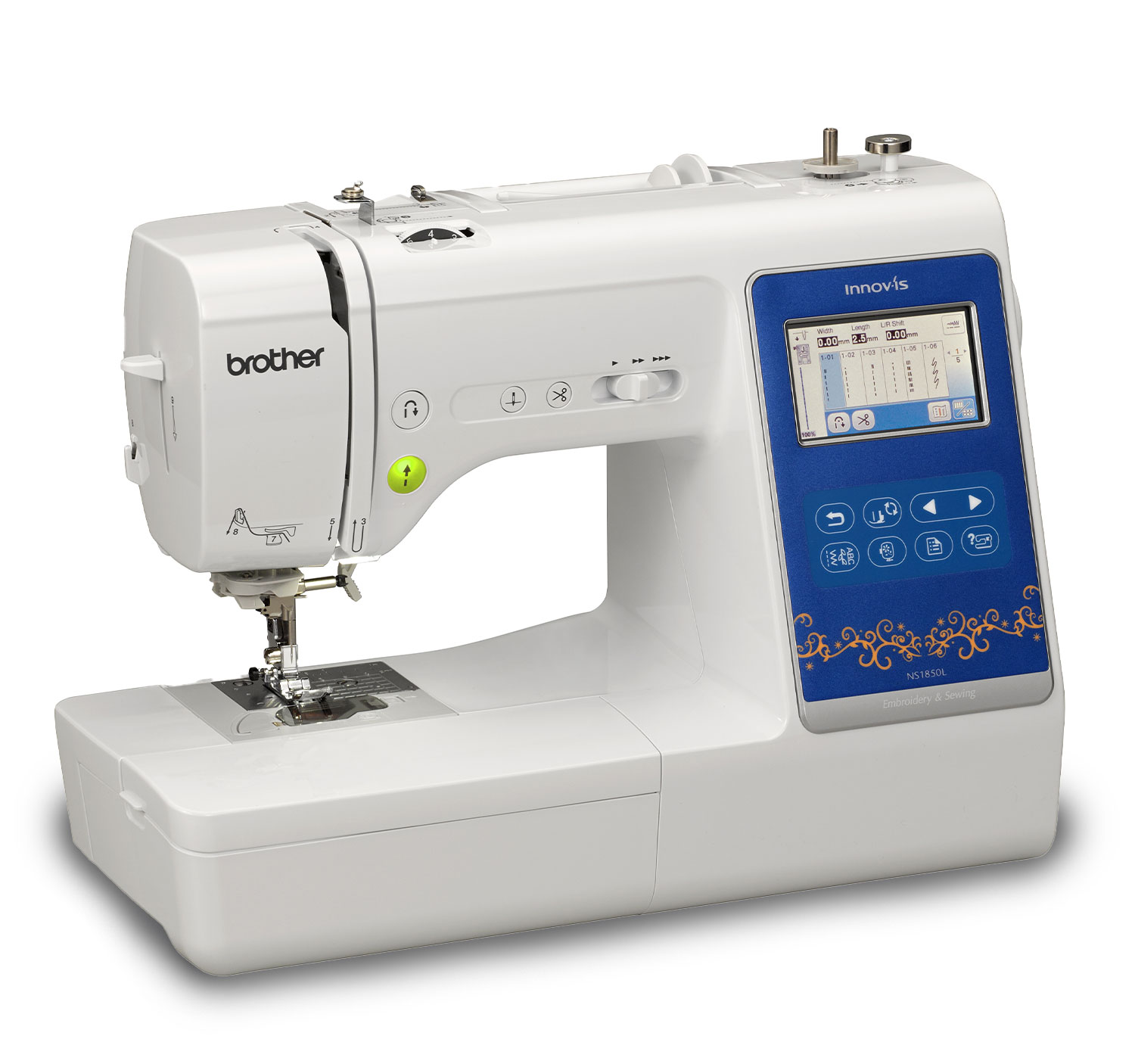 181 puntadas + 135 diseños de bordado. Área de bordado de hasta 10 x 10 cm. Compatible con Artspira.
